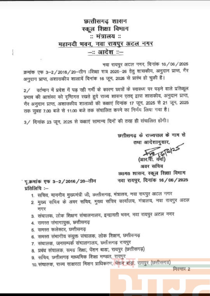 छत्तीसगढ़ शासन के स्कूल शिक्षा विभाग ने 16 जून 2025 को एक महत्वपूर्ण आदेश जारी किया है, जो प्रदेश भर के सरकारी, अनुदान प्राप्त और निजी (गैर अनुदान प्राप्त) स्कूलों पर लागू होगा। आदेश के अनुसार, शिक्षण सत्र 2025–26 की शुरुआत 16 जून 2025 से हो चुकी है।