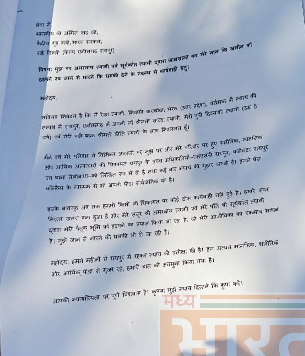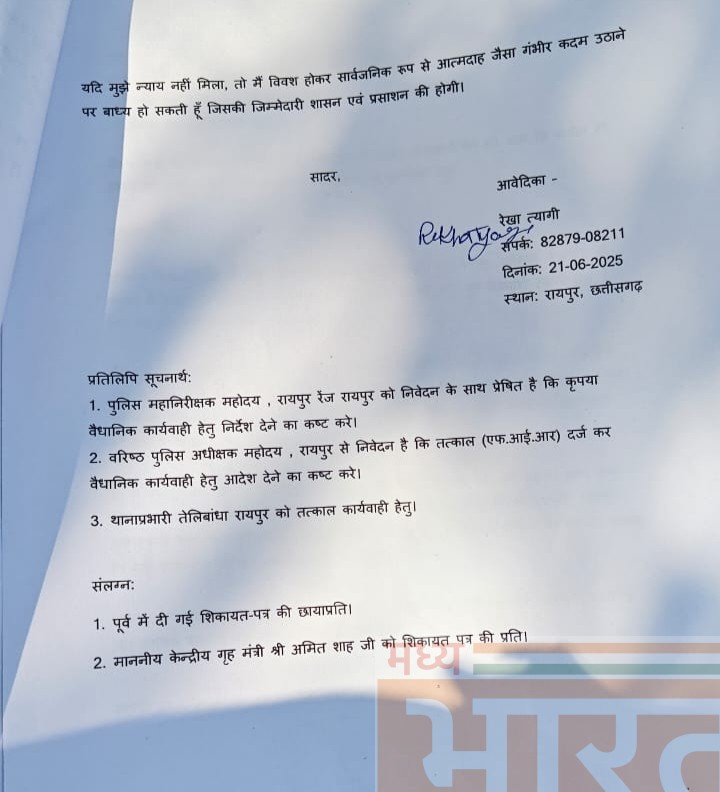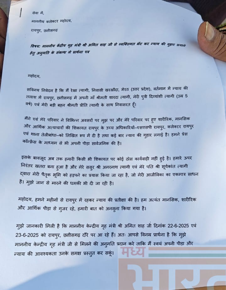 अब रेखा त्यागी न्याय की गुहार लेकर केंद्रीय गृह मंत्री अमित शाह से मिलने का निवेदन कर रही हैं, जो 22-23 जून 2025 को रायपुर दौरे पर रहेंगे। रेखा ने चेतावनी दी है कि यदि उसे न्याय नहीं मिला तो वह आत्मदाह करने के लिए मजबूर हो जाएगी, जिसकी पूरी जिम्मेदारी शासन और प्रशासन की होगी।
