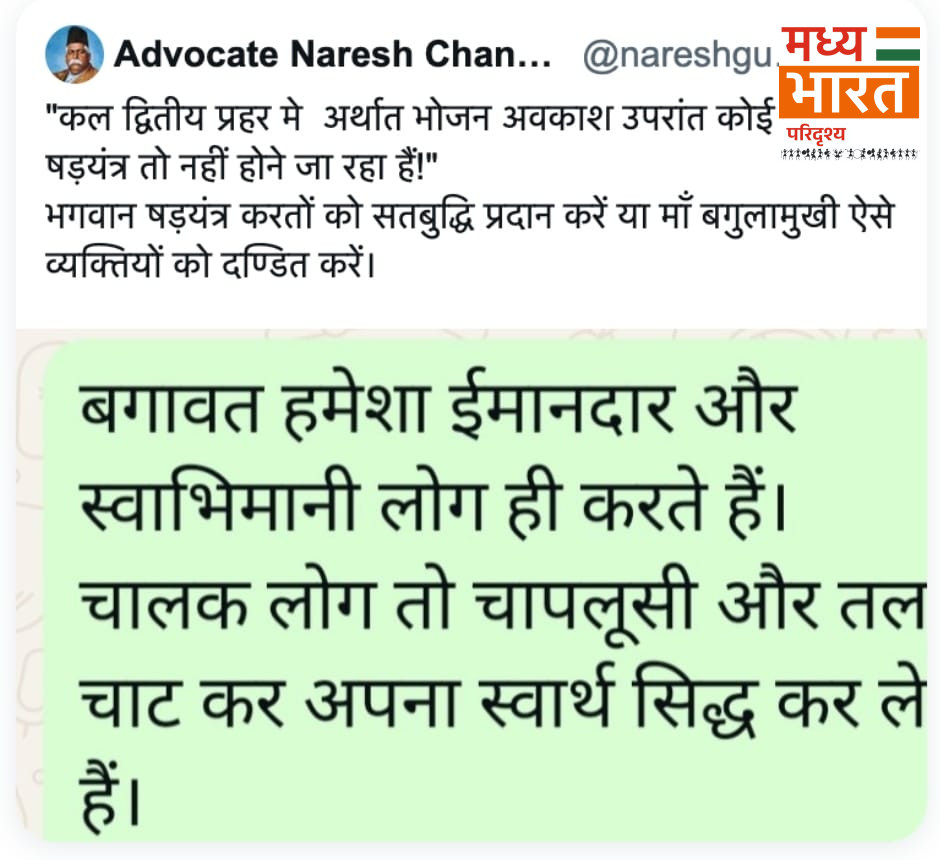 रायपुर। भाजपा के प्रदेश कार्यालय मंत्री नरेश चंद्र गुप्ता का एक ट्वीट राजधानी में राजनीतिक हलचल का केंद्र बन गया है। गुप्ता ने ट्वीट करते हुए लिखा, “कल द्वितीय प्रहर में अर्थात भोजन अवसर उपरांत कोई बड़ा षड्यंत्र तो नहीं होने जा रहा है!” इसके साथ ही उन्होंने भगवान से षड्यंत्रकारियों को सद्बुद्धि प्रदान करने की प्रार्थना की और माँ बगलामुखी से ऐसे व्यक्तियों के दमन की कामना की।
