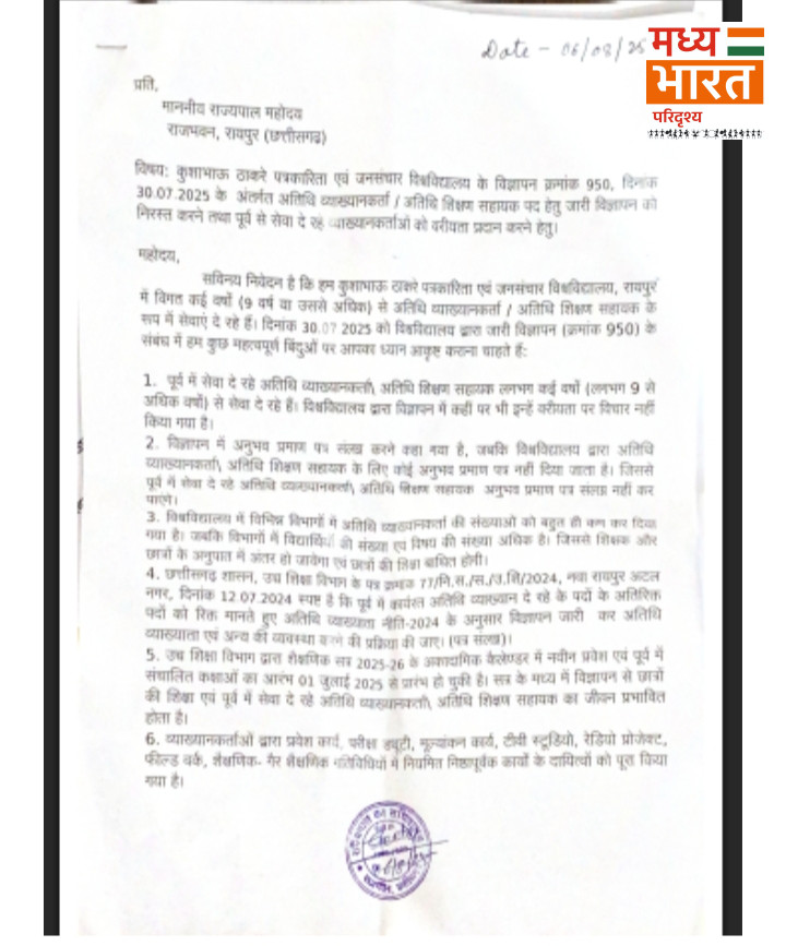 छत्तीसगढ़ की राजधानी रायपुर स्थित कुशाभाऊ ठाकरे पत्रकारिता एवं जनसंचार विश्वविद्यालय में अतिथि शिक्षकों की भर्ती प्रक्रिया को लेकर विवाद खड़ा हो गया है। यह मामला तब सामने आया जब विश्वविद्यालय प्रशासन ने उच्च शिक्षा विभाग के नियमों को दरकिनार करते हुए विज्ञापन जारी किया।