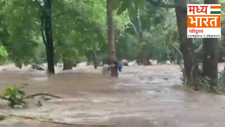 दंतेवाड़ा। लगातार हो रही भारी बारिश ने दंतेवाड़ा जिले में हालात बिगाड़ दिए हैं। गीदम-बारसूर मार्ग पर स्थित गणेश बहार नाला में सोमवार को अचानक पानी का तेज बहाव आने से एक बड़ा हादसा होते-होते टल गया। एक युवक अपनी बाइक समेत नाले में बह गया, लेकिन उसने साहस दिखाते हुए पास के पेड़ को पकड़ लिया। करीब तीन घंटे तक वह पानी में फंसा रहा।