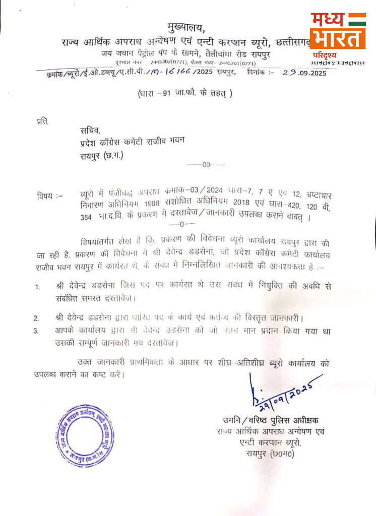 ब्यूरो ने कांग्रेस से कहा है कि यह जानकारी जल्द से जल्द EOW कार्यालय में जमा कराई जाए, ताकि जांच आगे बढ़ सके।