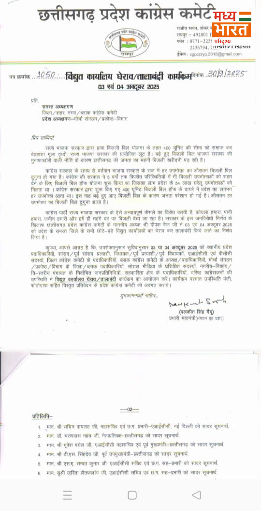 छत्तीसगढ़ की राजनीति में एक बार फिर बिजली बिलों को लेकर हलचल तेज हो गई है। प्रदेश की कांग्रेस पार्टी ने राज्य सरकार के हालिया निर्णय—‘बिजली हाफ बिल योजना’ खत्म करने और बिजली दरों में बढ़ोतरी—के खिलाफ मोर्चा खोल दिया है। कांग्रेस ने इसे जनता के साथ धोखा बताते हुए आगामी 3 और 4 अक्टूबर को राज्यव्यापी आंदोलन करने की घोषणा की है।