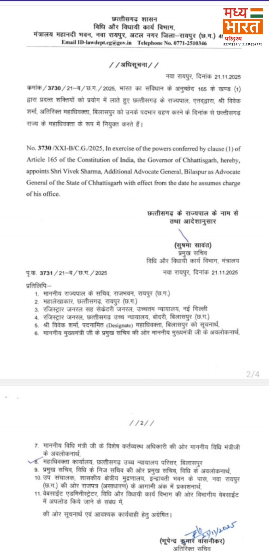 छत्तीसगढ़ सरकार ने बिलासपुर हाईकोर्ट के अतिरिक्त महाधिवक्ता विवेक शर्मा को नया महाधिवक्ता बना दिया है। राज्यपाल ने उनकी नियुक्ति को मंजूरी दी, जिसके बाद विधि विभाग ने आदेश जारी किया। पूर्व महाधिवक्ता के इस्तीफे के बाद यह पद खाली था, जिसे अब विवेक शर्मा ने संभाल लिया है।