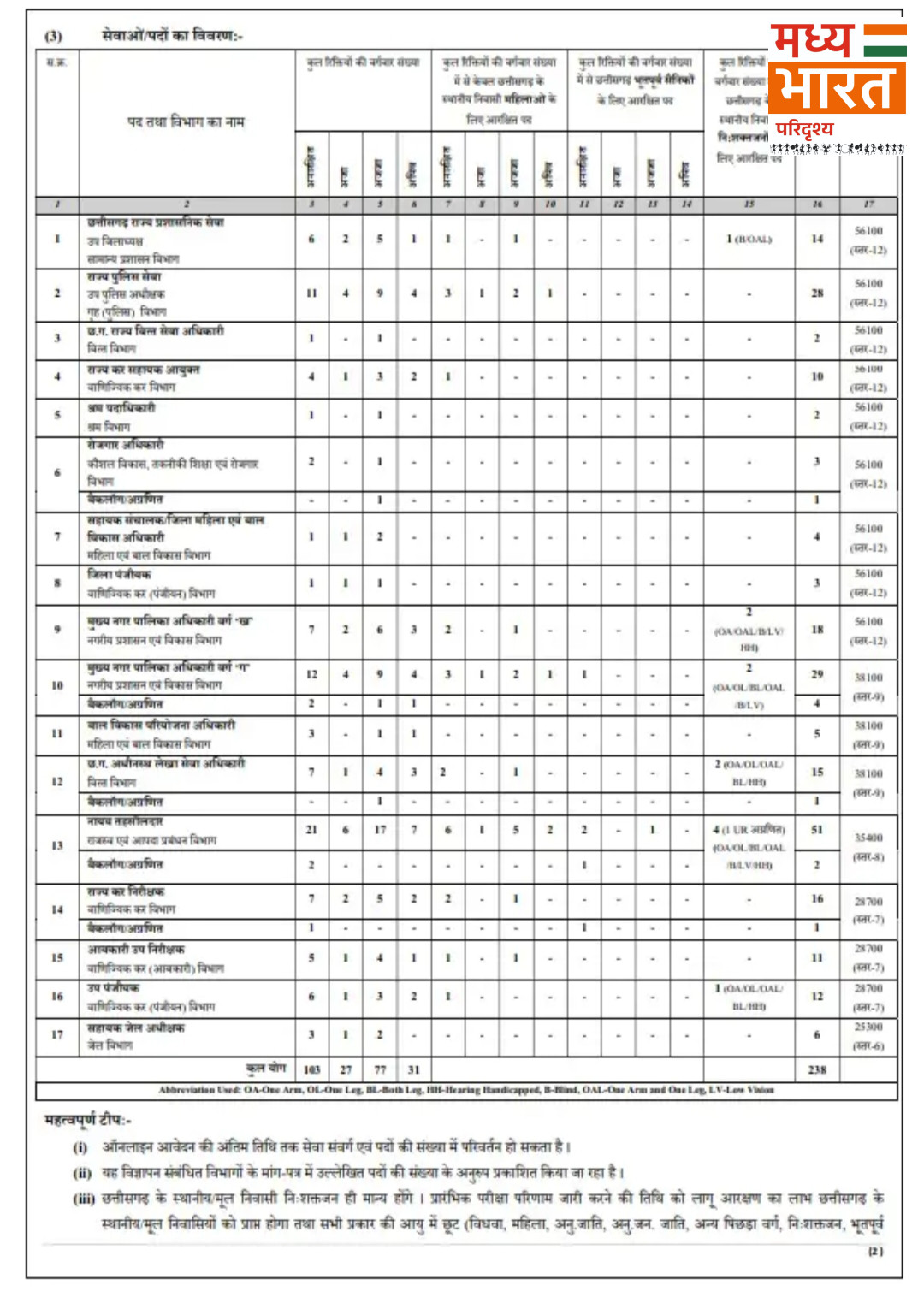छत्तीसगढ़ लोक सेवा आयोग (CGPSC) ने राज्य सेवा परीक्षा 2025 का बहुप्रतीक्षित नोटिफिकेशन जारी कर दिया है। इस बार कुल 238 पदों पर भर्ती की जाएगी। सबसे अधिक पद मुख्य नगर पालिका अधिकारी (CMO) के लिए रखे गए हैं, जिनकी संख्या 29 है। इसके साथ ही राज्य पुलिस सेवा में 28 पद और डिप्टी कलेक्टर के लिए 14 पद शामिल किए गए हैं। प्रशासनिक सेवाओं में रुचि रखने वाले अभ्यर्थियों के लिए यह बड़ा अवसर माना जा रहा है।
