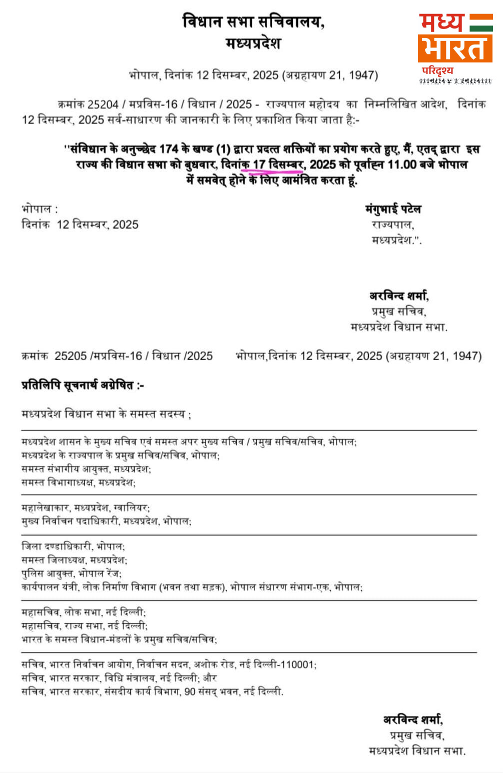 भोपाल।मध्य प्रदेश की राजनीति में एक अहम घटनाक्रम सामने आया है। राज्यपाल मंगुभाई पटेल ने विधानसभा का एक दिवसीय विशेष सत्र बुलाने की अधिसूचना जारी कर दी है। यह सत्र बुधवार, 17 दिसंबर 2025 को पूर्वाह्न 11 बजे भोपाल में आयोजित किया जाएगा।