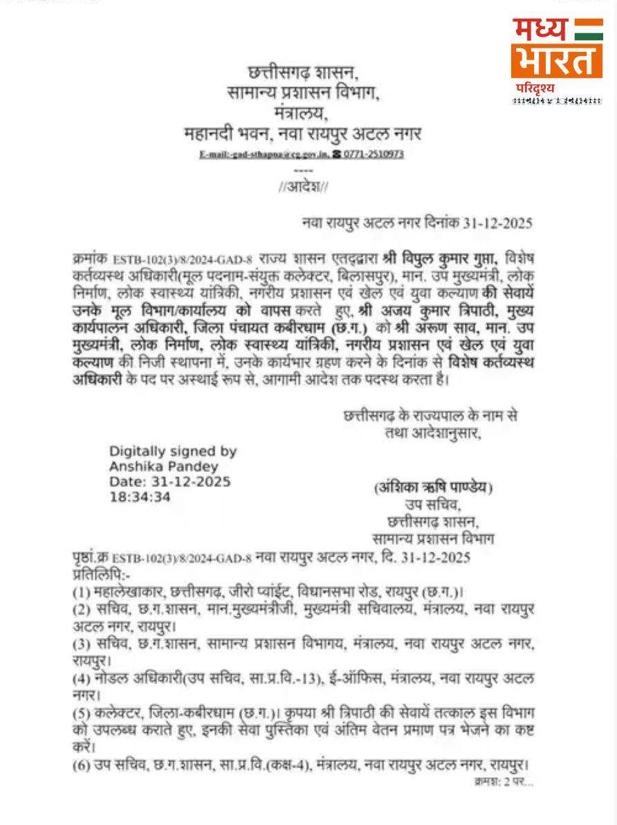 सरकार की ओर से जारी आदेश के अनुसार, कबीरधाम जिला पंचायत के मुख्य कार्यपालन अधिकारी (CEO) अजय कुमार त्रिपाठी को उपमुख्यमंत्री अरुण साव का नया OSD नियुक्त किया गया है। यह नियुक्ति भी तत्काल प्रभाव से लागू मानी जा रही है।