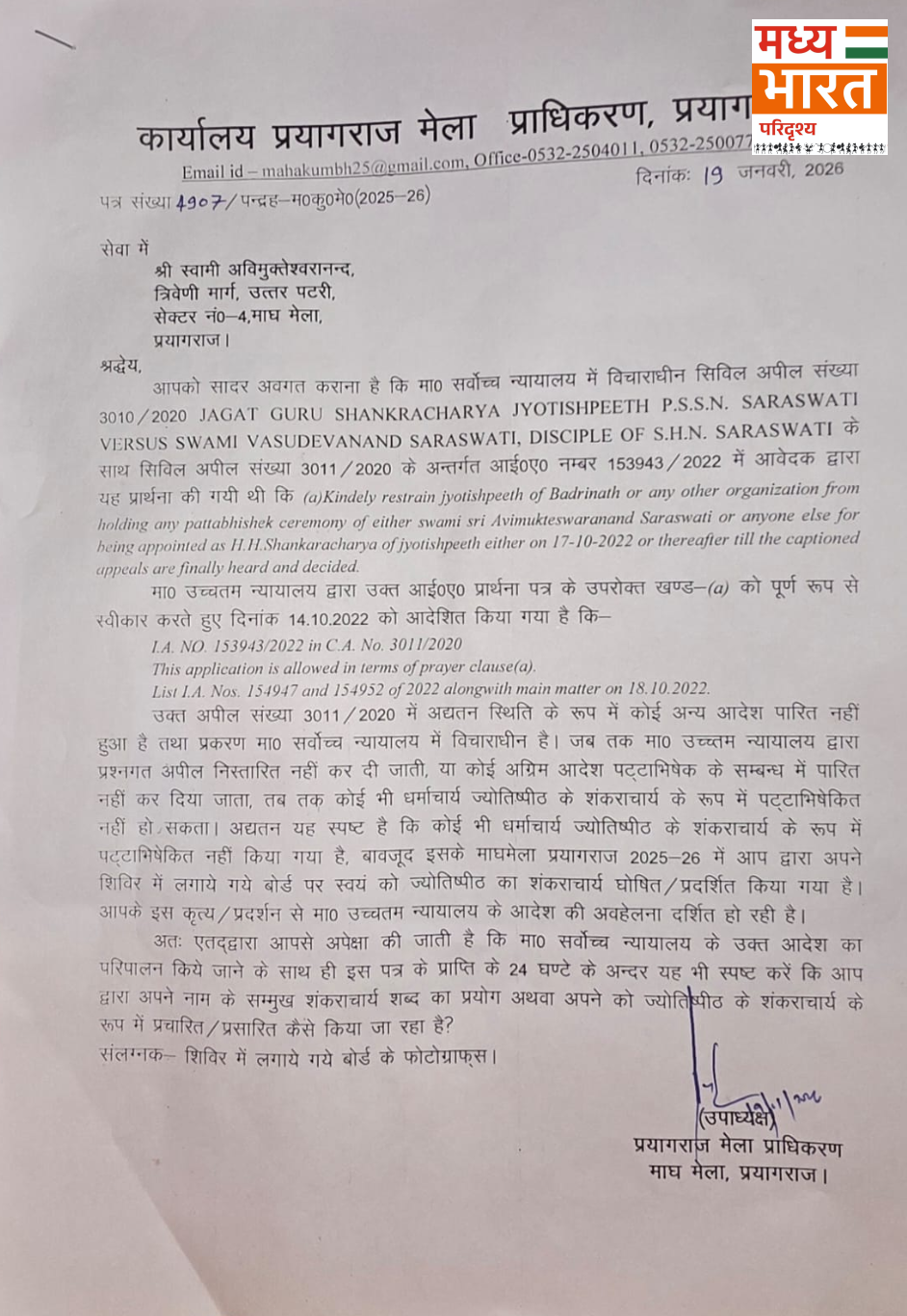 प्राधिकरण ने अपने नोटिस में सुप्रीम कोर्ट में विचाराधीन सिविल अपील का हवाला देते हुए कहा है कि जब तक इस मामले में अंतिम आदेश पारित नहीं हो जाता, तब तक ज्योतिष्पीठ के शंकराचार्य के रूप में किसी का पट्टाभिषेक वैधानिक रूप से मान्य नहीं हो सकता। इसके बावजूद मेला क्षेत्र में स्वामी अविमुक्तेश्वरानंद के शिविर के बोर्ड पर उनके नाम के आगे ‘शंकराचार्य’ लिखा हुआ पाया गया।