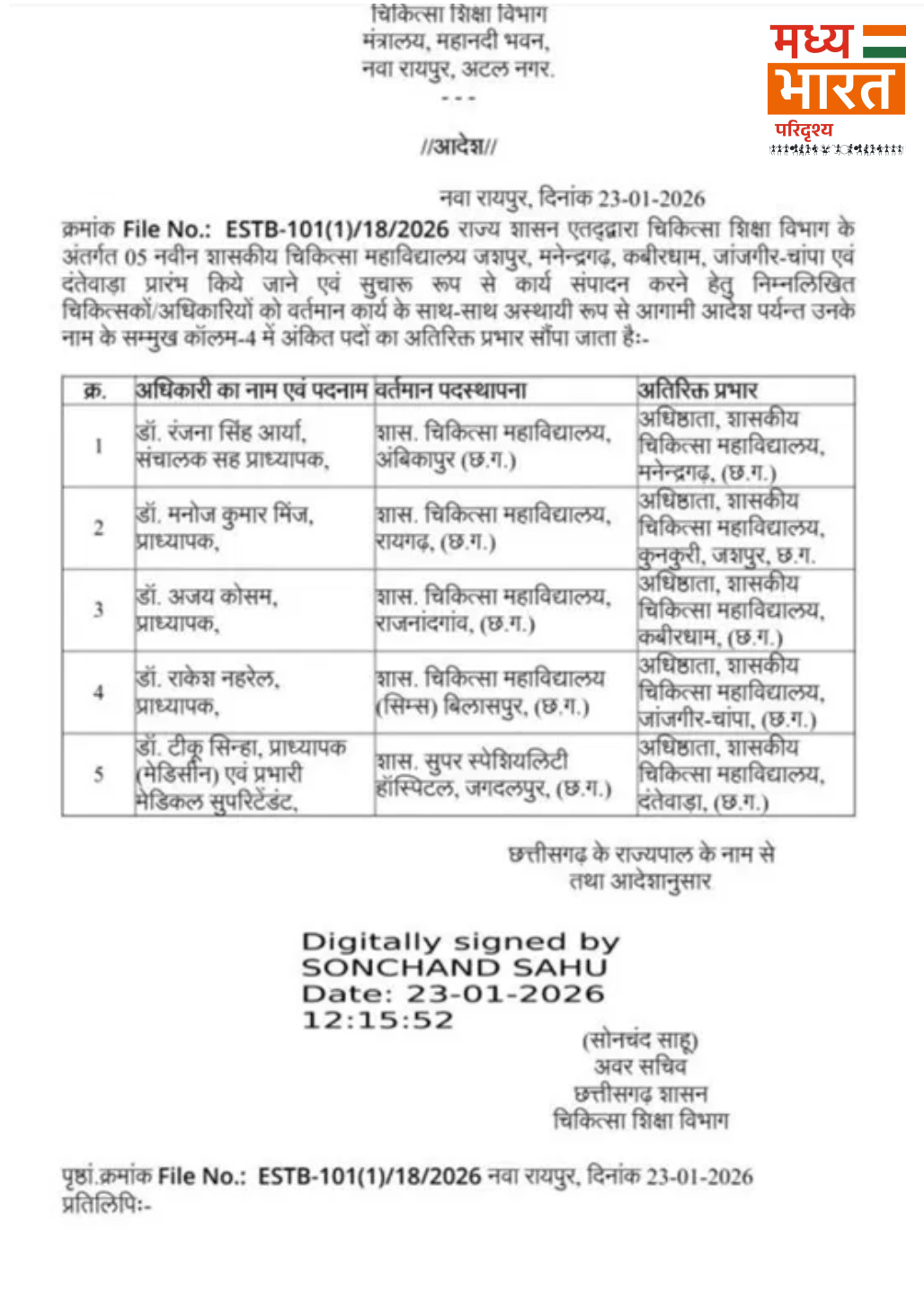 रायपुर। छत्तीसगढ़ सरकार ने राज्य के स्वास्थ्य और चिकित्सा शिक्षा क्षेत्र को मजबूत करने की दिशा में एक अहम निर्णय लिया है। राज्य में हाल ही में शुरू किए गए पांच नए मेडिकल कॉलेजों में डीन की नियुक्ति कर दी गई है। चिकित्सा शिक्षा विभाग ने इस संबंध में आधिकारिक आदेश जारी कर दिया है।