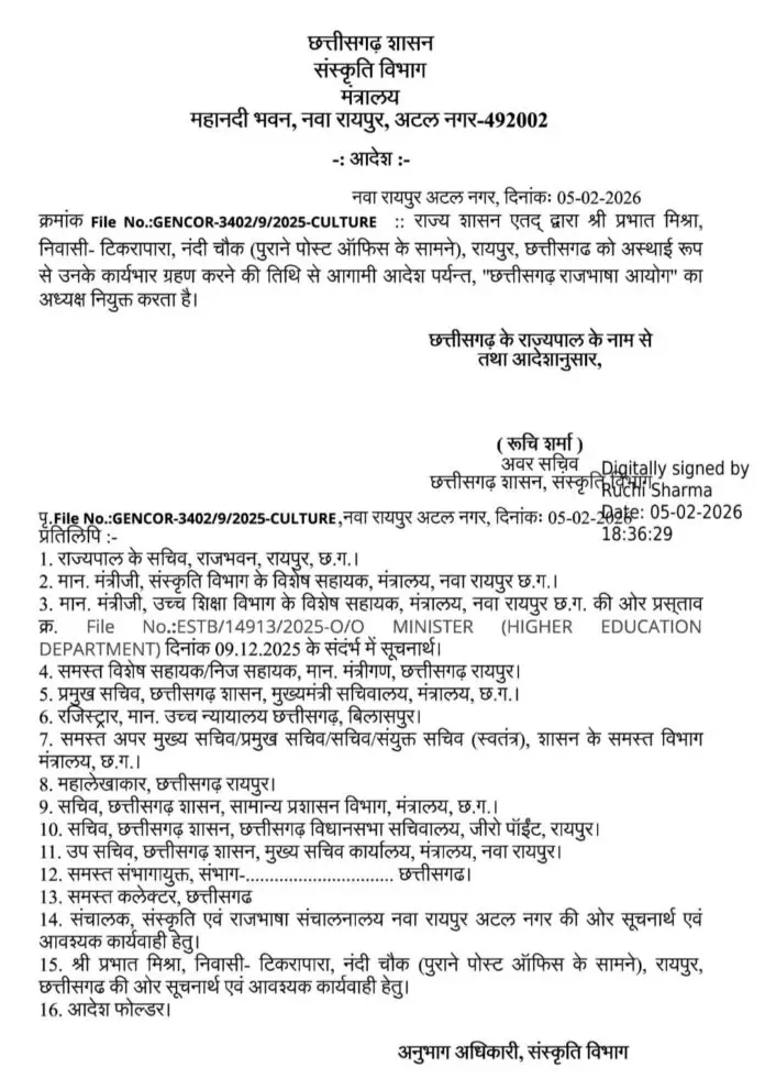 यह नियुक्ति छत्तीसगढ़ के राज्यपाल के नाम से आदेशानुसार की गई है। आदेश पर संस्कृति विभाग की अवर सचिव रुचि शर्मा के डिजिटल हस्ताक्षर अंकित हैं।