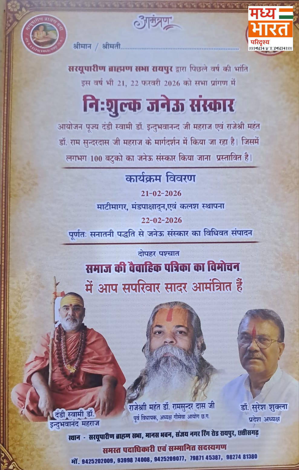 सरयूपारीण ब्राह्मण सभा रायपुर द्वारा पिछले वर्ष की भांति इस वर्ष भी 21 एवं 22 फरवरी 2026 को सभा प्रांगण, मानस भवन (संजय नगर रिंग रोड, रायपुर) में 2 दिवसीय निःशुल्क जनेऊ (उपनयन) संस्कार का भव्य आयोजन किया गया है। कार्यक्रम का शुभारंभ आज दोपहर से वैदिक मंत्रोच्चार के साथ हुआ, जबकि समापन कल दोपहर 3 बजे बटुकों की पारंपरिक बारात निकाले जाने के पश्चात होगा।