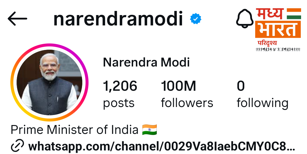 भारत के प्रधानमंत्री नरेंद्र मोदी ने सोशल मीडिया की दुनिया में एक और बड़ी उपलब्धि अपने नाम कर ली है। फोटो और वीडियो शेयरिंग प्लेटफॉर्म Instagram पर उनके फॉलोअर्स की संख्या 10 करोड़ (100 मिलियन) के पार पहुंच गई है। इस आंकड़े को छूने वाले वे दुनिया के पहले राजनीतिक नेता बन गए हैं।