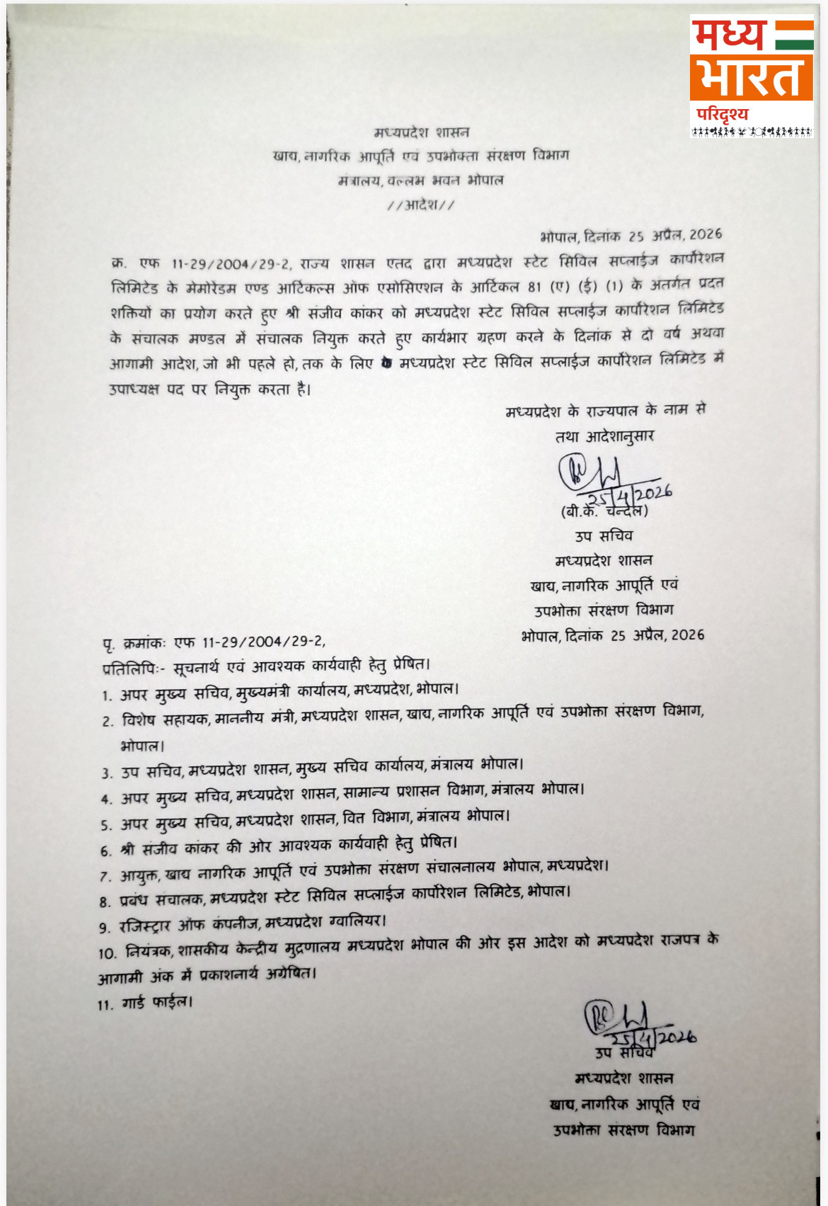 मध्यप्रदेश सरकार ने 25 अप्रैल को तीन प्रमुख निगमों में अहम राजनीतिक नियुक्तियां करते हुए सियासी हलकों में हलचल तेज कर दी है। स्टेट सिविल सप्लाइज कॉर्पोरेशन, महाराणा प्रताप कल्याण बोर्ड और राज्य वन विकास निगम में किए गए ये बदलाव महज प्रशासनिक नहीं, बल्कि 2027 विधानसभा चुनाव की रणनीति का हिस्सा माने जा रहे हैं।
