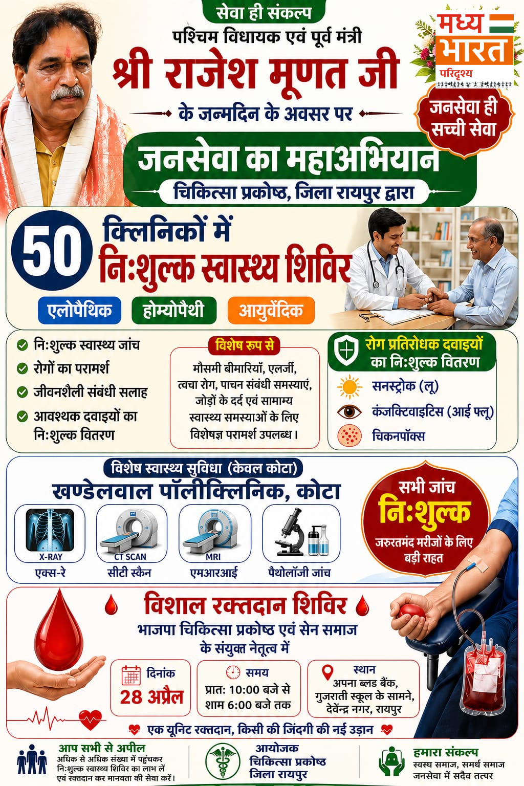 रायपुर: जनसेवा को प्राथमिकता देते हुए पश्चिम विधायक और पूर्व मंत्री राजेश मूणत के जन्मदिन पर इस बार शहर में एक बड़ा स्वास्थ्य अभियान आयोजित किया जा रहा है। भाजपा चिकित्सा प्रकोष्ठ, जिला रायपुर की ओर से शुरू हो रहे इस विशेष कार्यक्रम में स्वास्थ्य सेवाओं को आम लोगों तक पहुंचाने की कोशिश की जा रही है।
