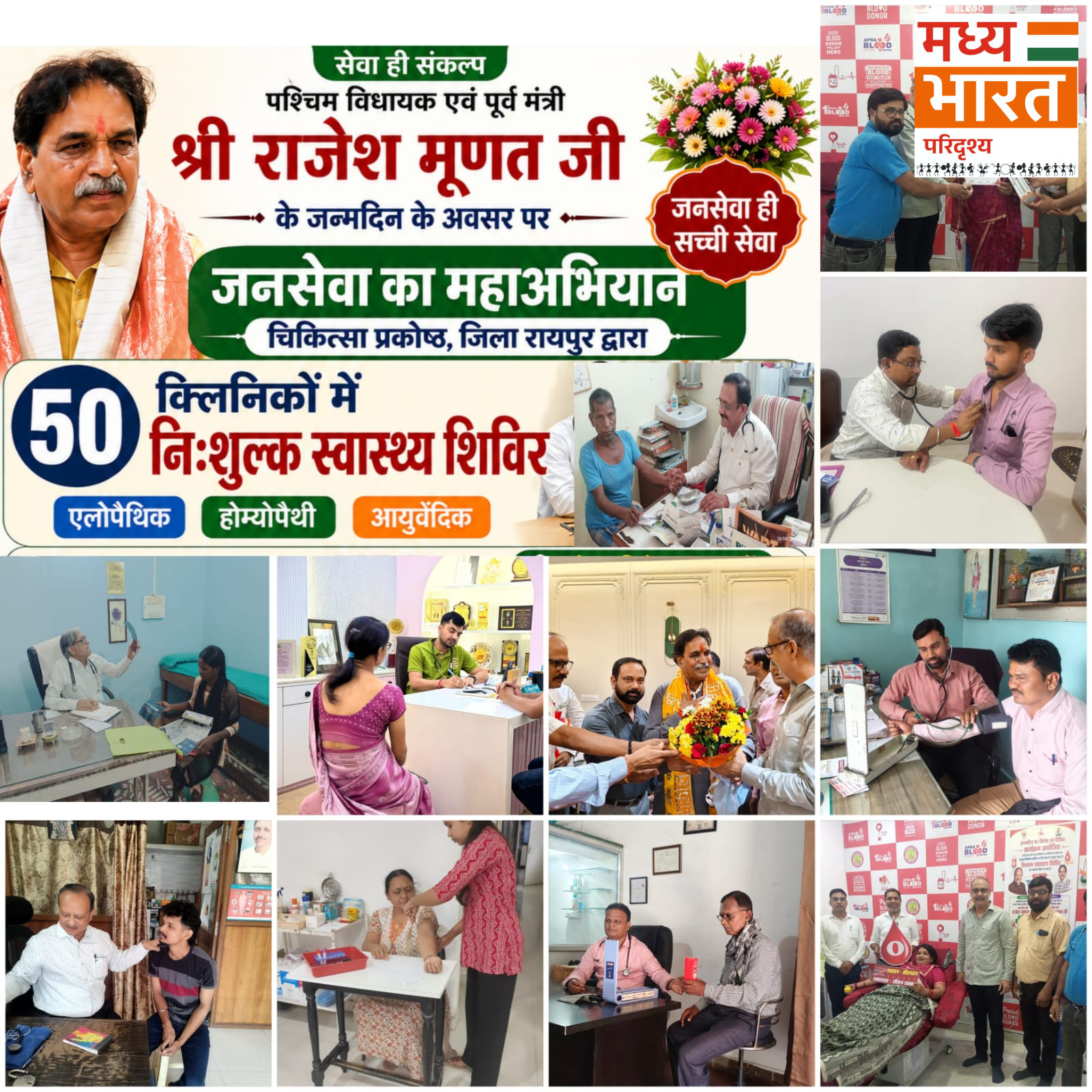 राजेश मूणत के जन्मदिन के अवसर पर भाजपा चिकित्सा प्रकोष्ठ, जिला रायपुर द्वारा सेवा और जनहित से जुड़े विभिन्न कार्यक्रमों का आयोजन किया गया। इस अवसर को जनसेवा के रूप में मनाते हुए जिले के 51 क्लीनिक एवं अस्पतालों में निःशुल्क चिकित्सा शिविर एवं परामर्श शिविर लगाए गए, जिनका लाभ बड़ी संख्या में मरीजों ने उठाया।