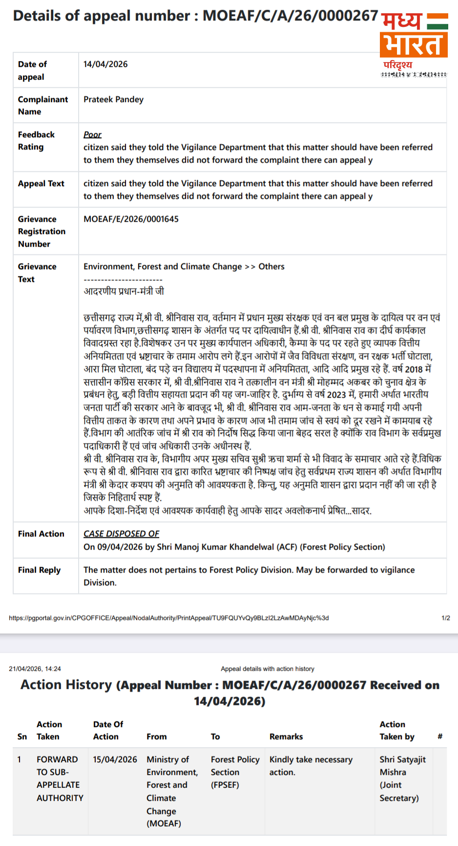 जन-प्रतिनिधि प्रतीक पाण्डेय ने वर्तमान प्रधान मुख्य वन संरक्षक (PCCF) और वन बल प्रमुख श्री वी. श्रीनिवास राव के विरुद्ध गंभीर आरोप लगाए हैं। मुख्य आरोप निम्नलिखित हैं: