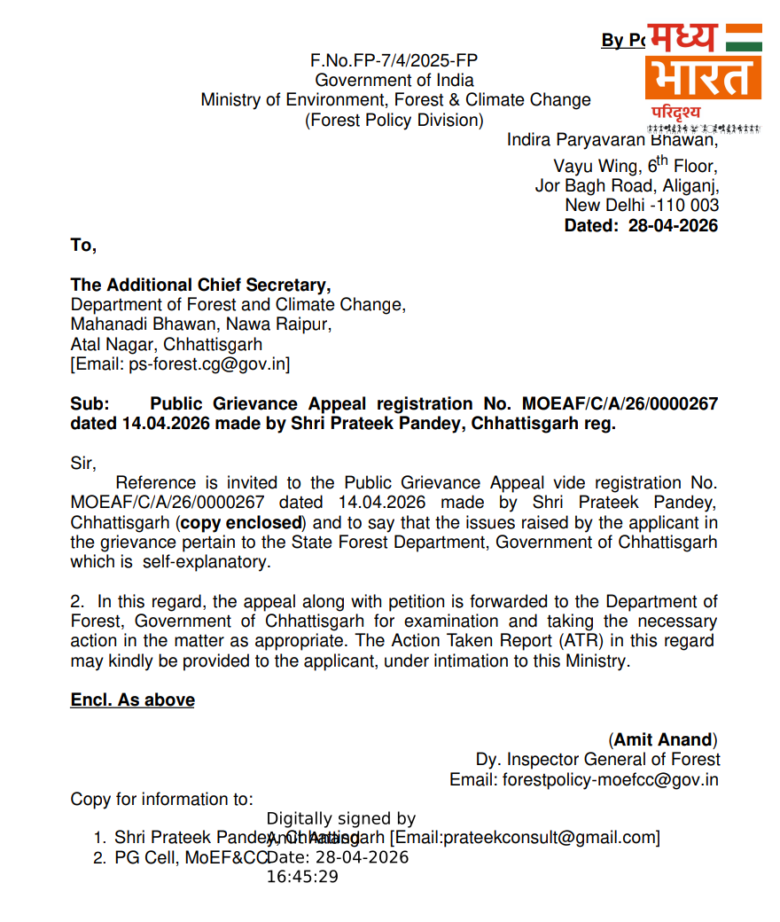 शिकायतकर्ता द्वारा प्रधानमंत्री कार्यालय और केंद्रीय मंत्रालय में की गई अपील के बाद, भारत सरकार के उप वन महानिरीक्षक अमित आनंद ने छत्तीसगढ़ के अपर मुख्य सचिव को पत्र भेजकर मामले को राज्य वन विभाग को हस्तांतरित किया है। मंत्रालय ने स्पष्ट किया है कि इस मामले में आवश्यक कार्यवाही कर आवेदक को सूचित किया जाए।